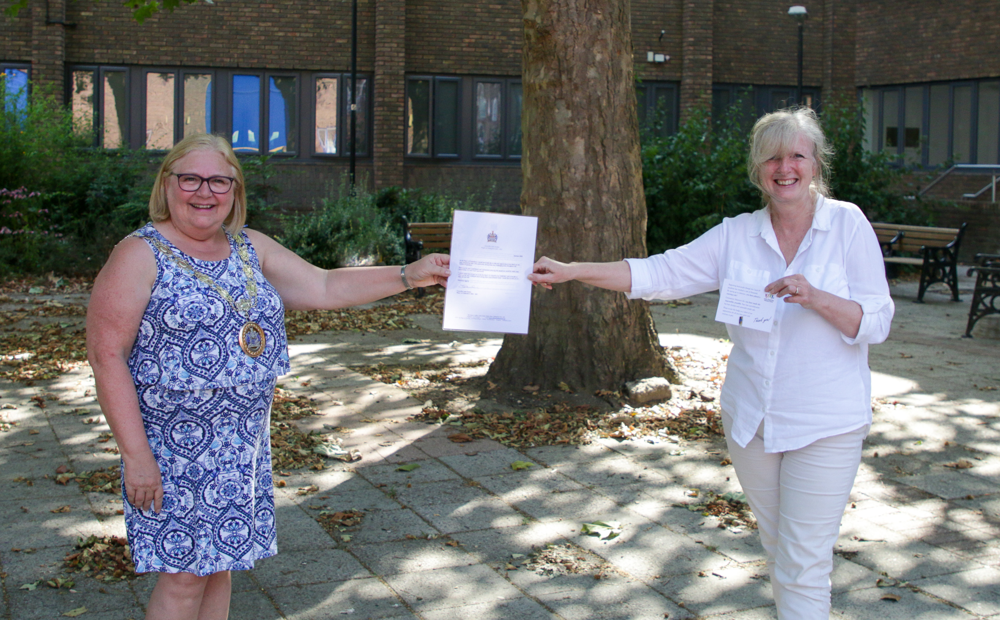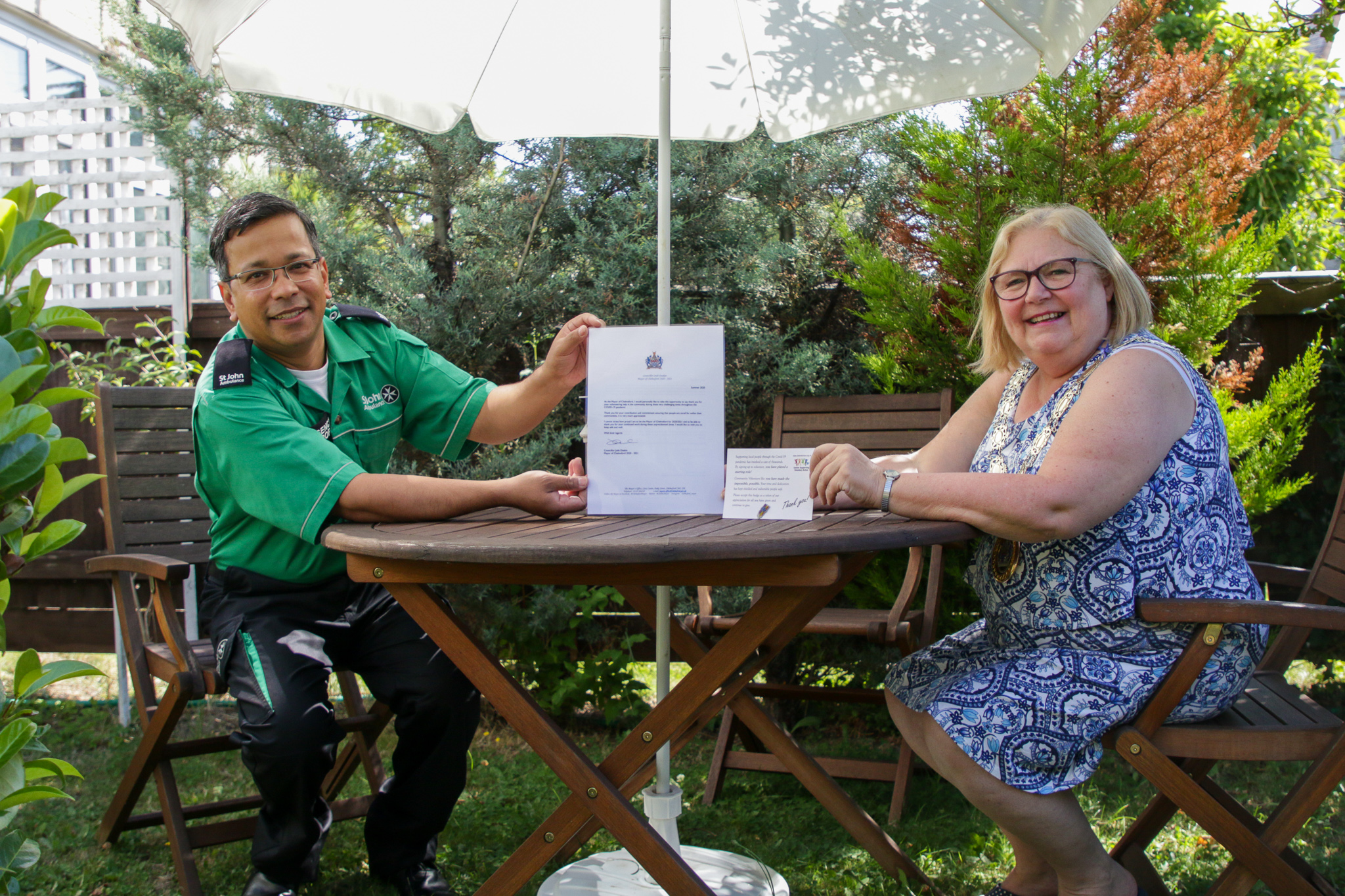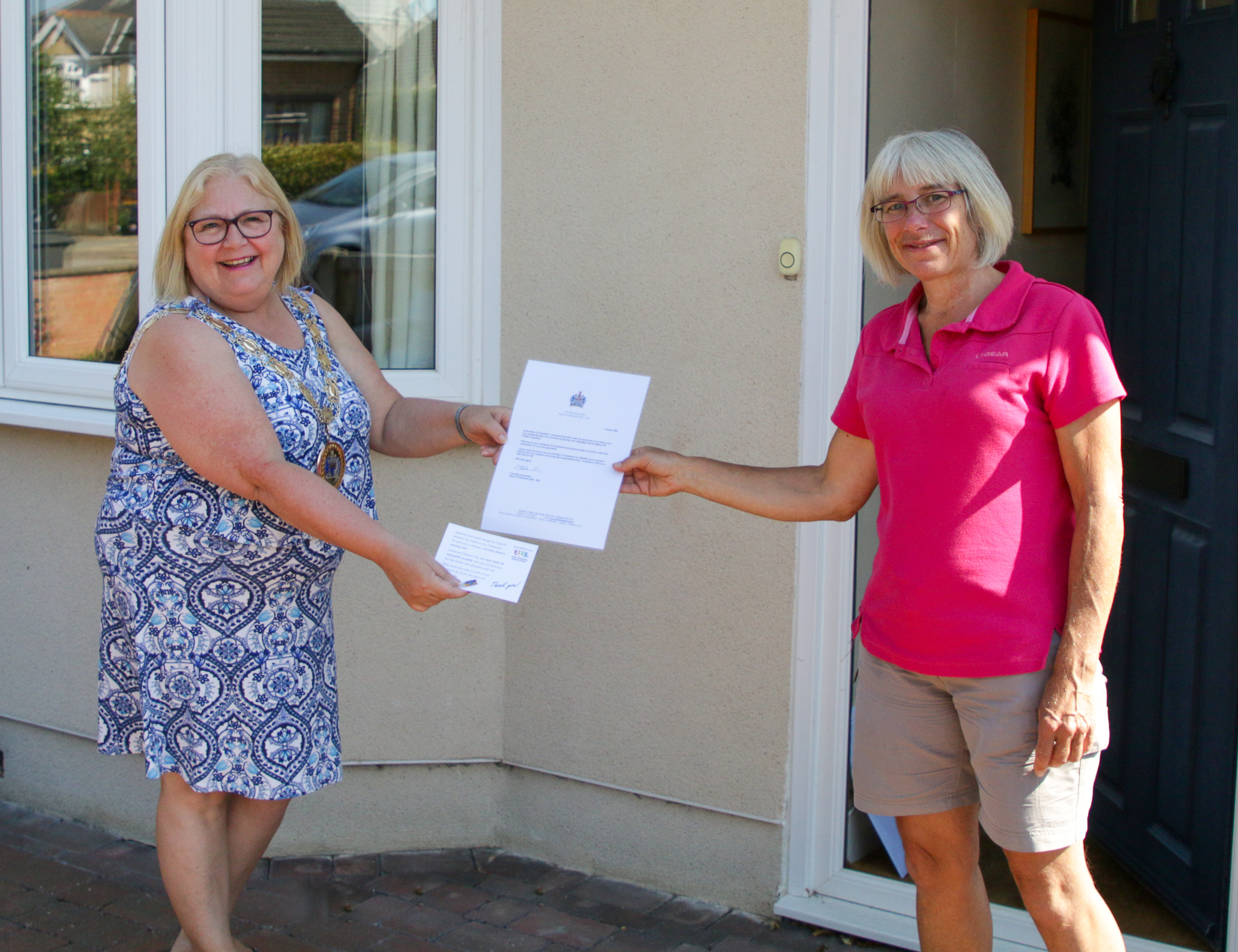 The Mayor of Chelmsford, Cllr Jude Deakin, surprised some local people in August with a doorstep visit to offer a personal thank you for volunteering for Chelmsford Community Resilience Hub. Hub volunteers were presented with letters from the Mayor and Lord Lieutenant, together with a card and specially designed Community Volunteer (CV) pin from Chelmsford CVS as a token of appreciation for all that they have given in these times.
